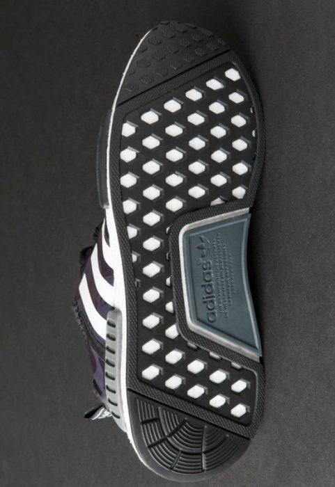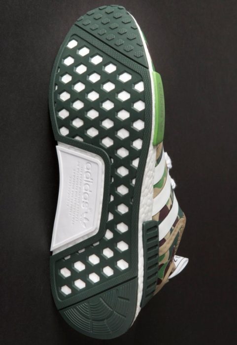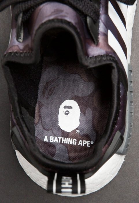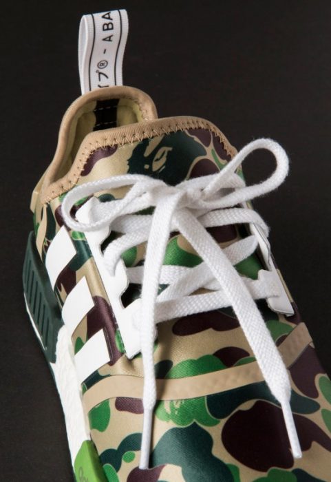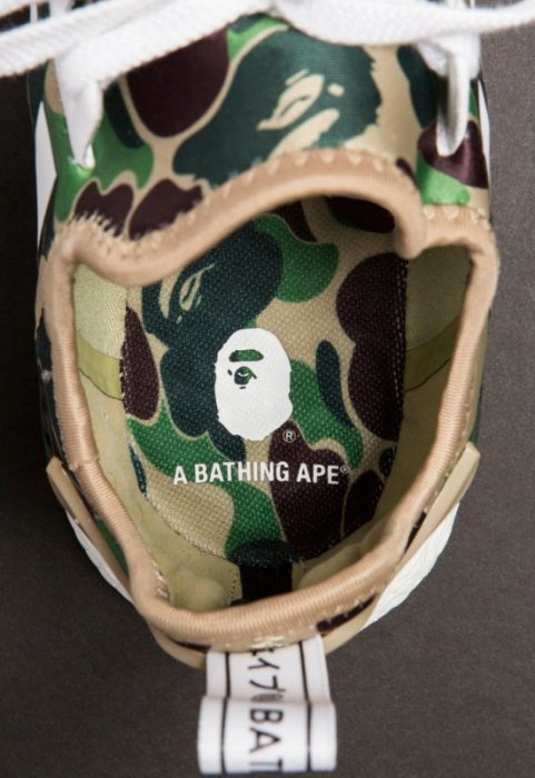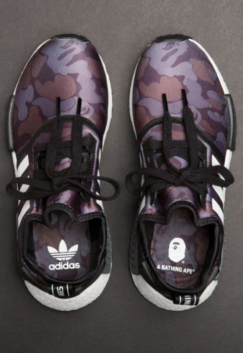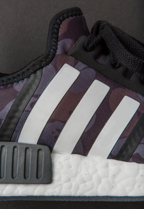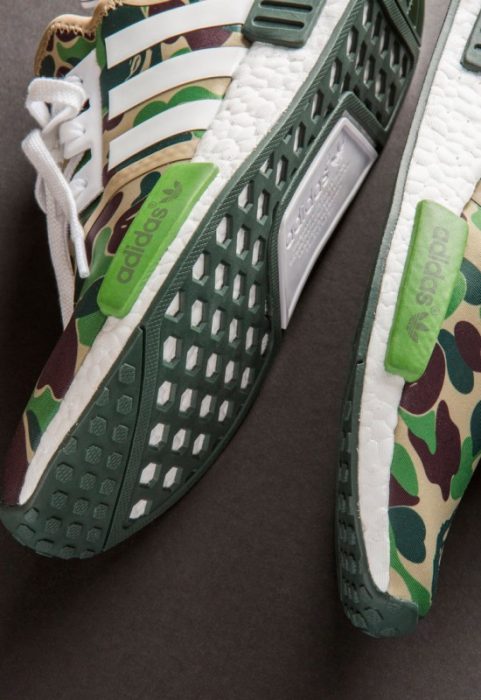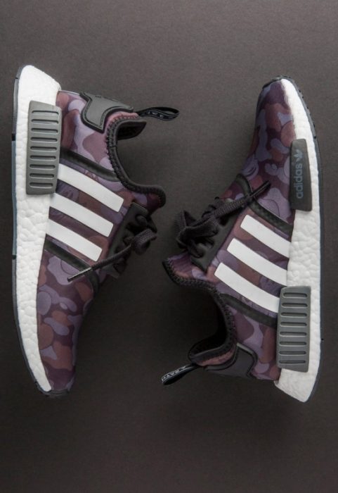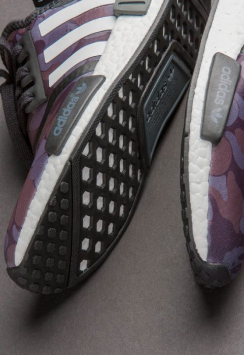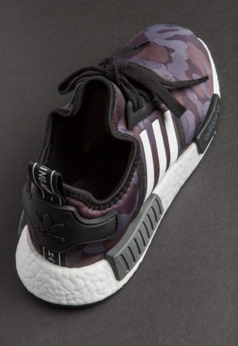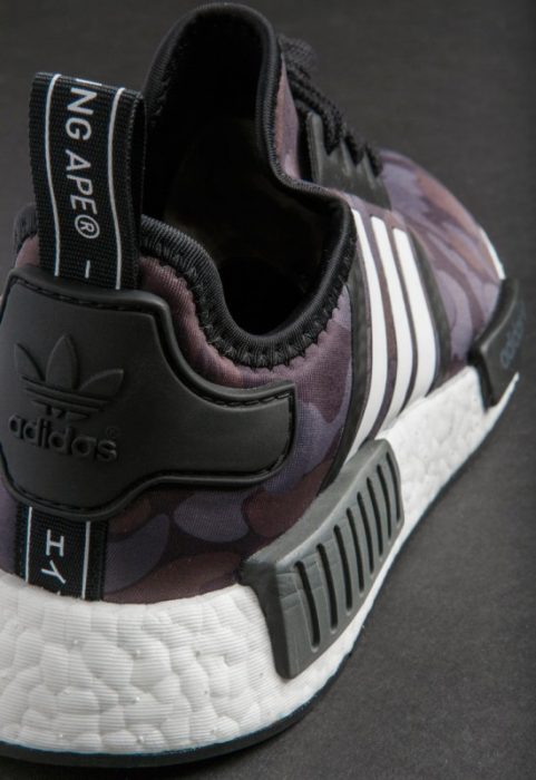 Hasta hoy sólo contábamos con una imagen de los dos modelos que están por salir, pero recientemente han salido más fotos que nos muestran todos los detalles de estas sneakers. El diseño propio de las NMD quedará prácticamente intacto, pero la colaboración llegará a través de dos colores distintos: verde y púrpura. Eso sí, ambos con el característico estampado camo tan propio de BAPE. Además, encontraremos el branding de la marca japonesa tanto en el talón como en la suela interior.