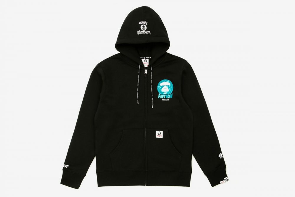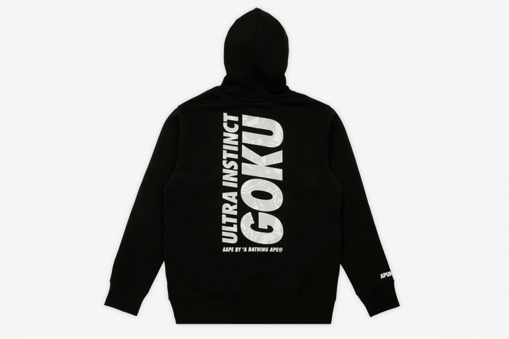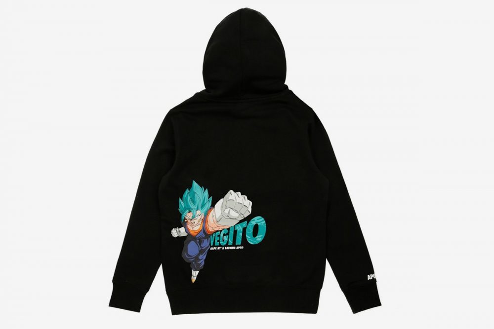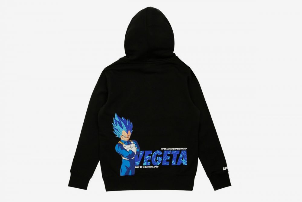 Para la colección, desde AAPE han escogido el negro como referencia sobre la que trabajar. A partir de ahi, han diseñado una serie de sudaderas, chaquetas y capuchas que cuentan con los personajes de la vigésima película de Dragon Ball. Aunque también podemos ver a Goku, Frieza, Vegeta y Vegito.