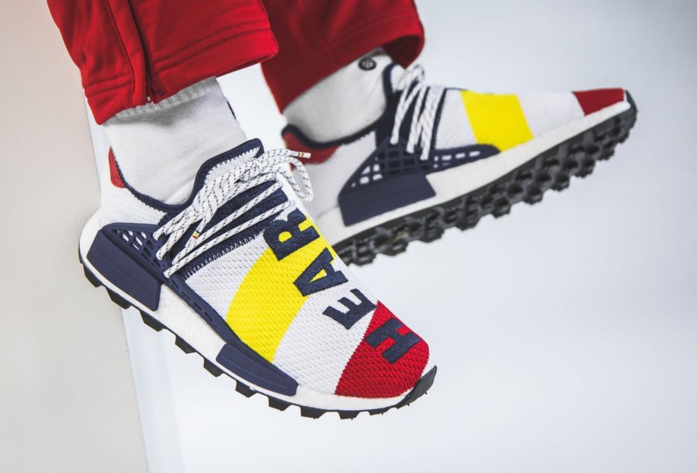 Originalmente nacido en primeknit amarillo, y luciendo, en color negro, los términos «HUMAN» y «RACE», a palabra por zapatilla, el modelo supuso tal éxito que su siguiente incursión en el mercado trajo cinco colourways distintos del tirón.