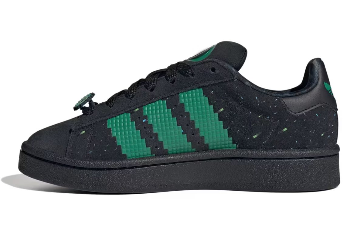 La Campus con la estética del Eye of Ender con una paleta negra y verde, o la Superstar, con inspiración del Ender Dragon, con escamas negras y efecto pixelado. Terminamos con unas Adilette slides que cierran perfecto el combo.