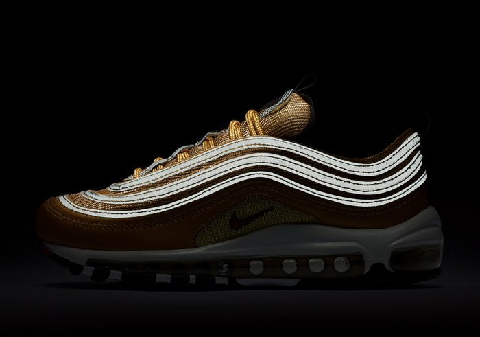 Como el propio nombre indica, estas Air Max 97 presentan un diseño en el que destaca el color dorado por encima de cualquier otra cosa. El tejido en cuero, el color metálico y sobre todo la unidad de aire en la suela son los elementos más significativos de estas nuevas sneakers. Y no sólo eso, ya que las zapatillas también incorporarán detalles como unas tiras de tejido que brillará en la oscuridad o el Swoosh en color rojo.