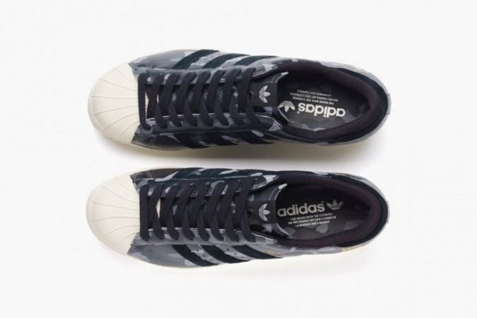 Ambas firmas nos presentan dos nuevas versiones de las Superstars 80s. El primero cuenta con un azul eléctrico muy provocativo sobre un estampado de camuflaje militar también color azul y más de los mismo encontramos en el otro par, que repite el camo esta vez en negro y el gris. Los dos diseños de zapas comparten la punta y suela en color blanco, los logos de las tres marcas y sus respectivos nombres en dorado.