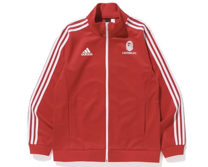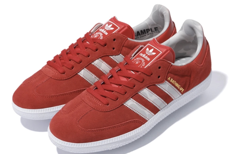 Si hablamos de las zapatillas, están inspiradas en los característicos modelos de adidas Originals, con la parte superior de ante rojo, el logo de BAPE en la lengüeta, y las siglas ‘A Bathing APE’ en un color dorado y situadas junto a los tres stripes de adidas.