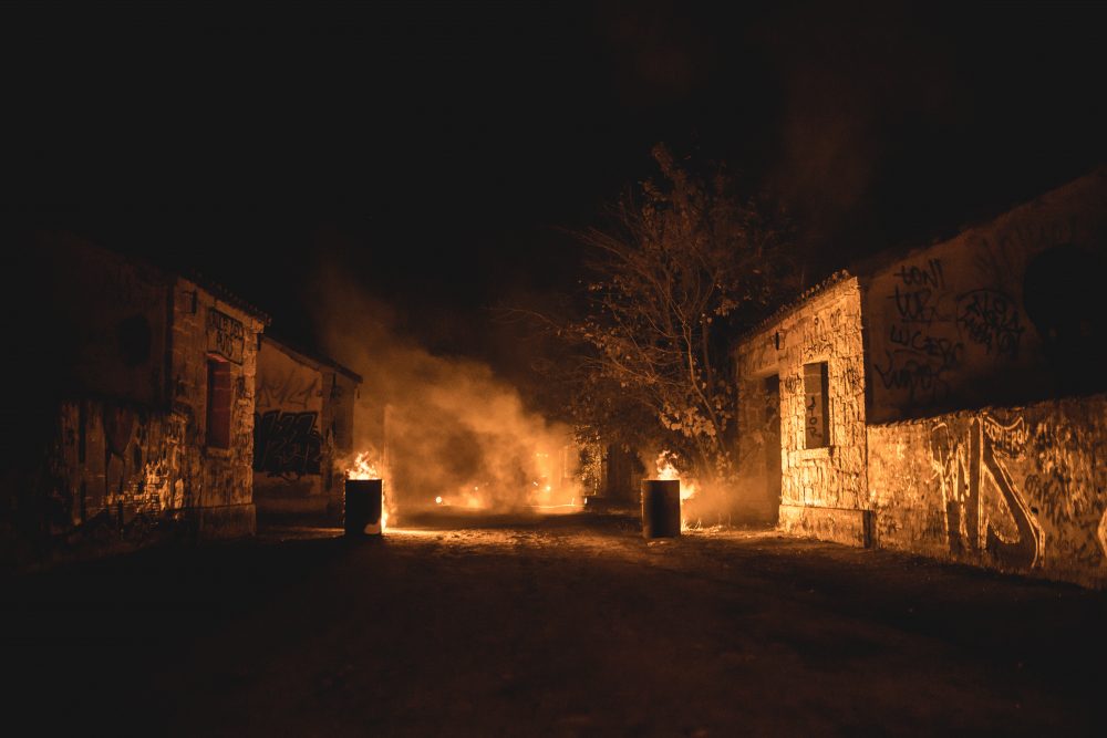 El Alamín es un puto sitio que mete más miedo que todos los decorados de Resident Evil y The Walking Dead juntos, por lo que el hecho de que el camino a pie fuese rodeado de barriles en llamas que invitaban a no entrar al más puro estilo serie de Movistar no ayudaba a bajar el acojone. La única luz que nos guió fue la de el propio fuego de los barriles y una antorcha que nos dejaron.