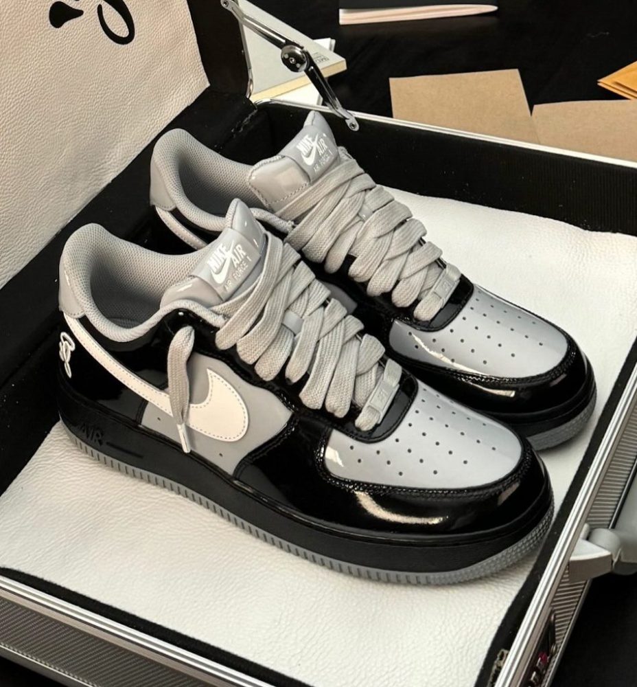El modelo ha sido visto en varios colores y se aleja de las Air Force 1 clásicas apostando por paneles de charol ultrabrillante en lugar del cuero liso habitual. El contraste también está a la orden del día, con combinaciones azul-fucsia o amarillo-azul, pero también opciones full granate o más discretas en tono negro.