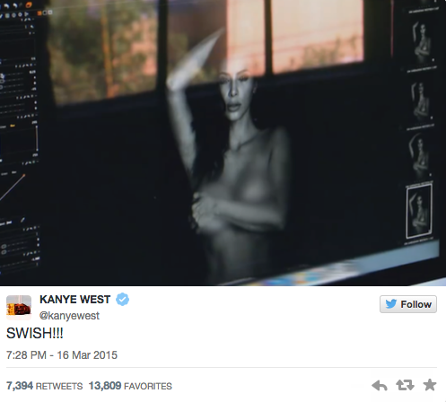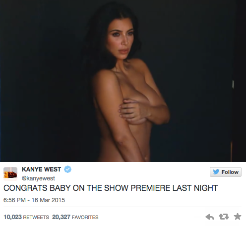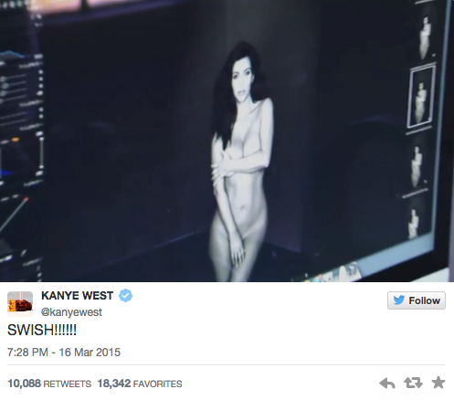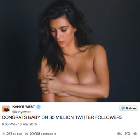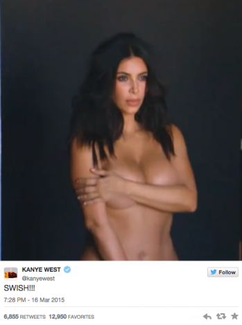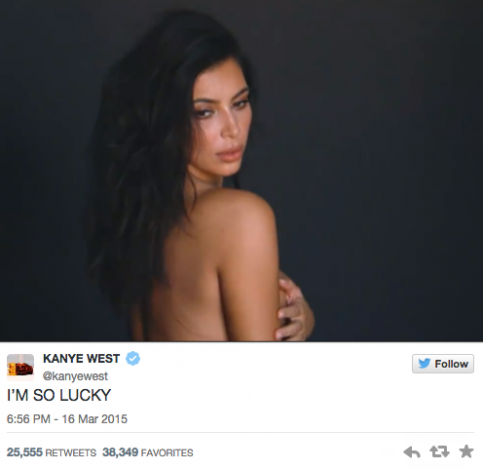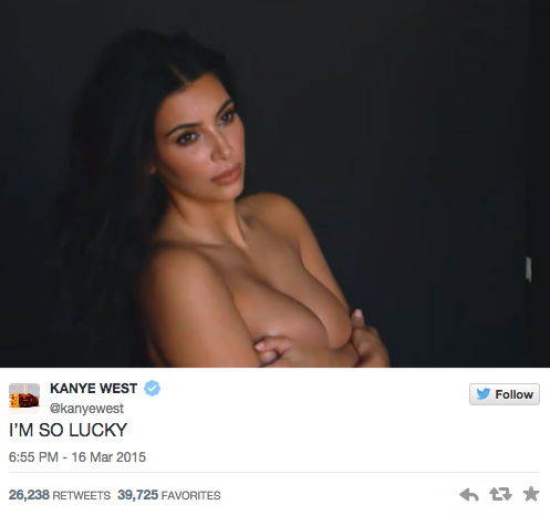 Con frases como «soy muy afortunado», «felicidades cariño por los 30 millones de seguidores en Twitter» o «felicidades cariño por el capítulo de ayer», Yeezy lanzó a la red ocho fotografías en las que Kim se tapa sutilmente con las manos sus partes más íntimas.