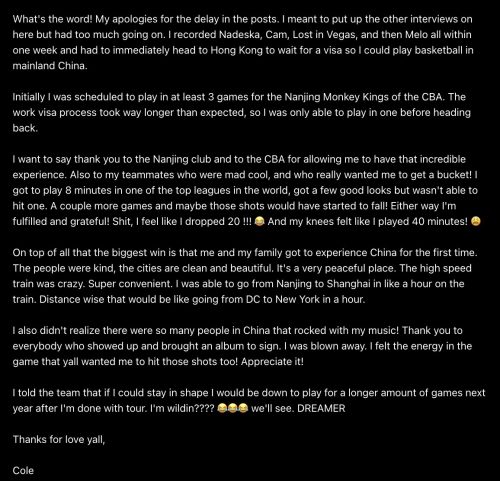 Lo que empezó como una de las historias más random y motivadoras del mes ha terminado antes de lo esperado. J. Cole ya no seguirá jugando en la liga china de baloncesto.