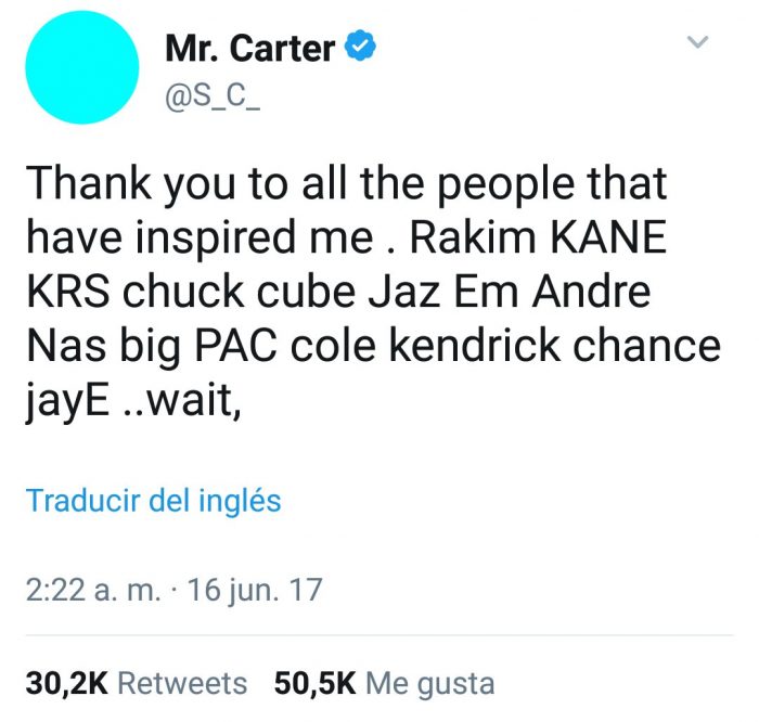 El padre de familia de los Carter se puso meloso ayer en Twitter relatando una lista de los raperos que más le han influido y por los que siente un tremendo respeto. Podemos encontrar nombres tanto de la nueva como de la vieja escuela, e incluso alguna sorpresa entre la larga pila de artistas mencionados. El motivo de todo esto viene dado por la reciente inclusión de Jay Z en el Hall of Fame de los escritores musicales americanos, conviertiendose así en el primer rapero en ser parte de este prestigioso grupo.
