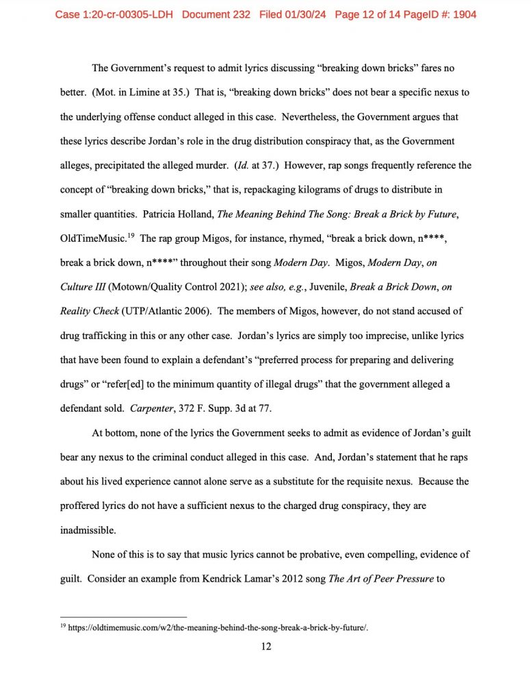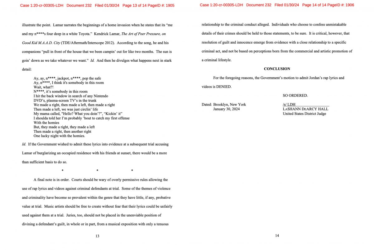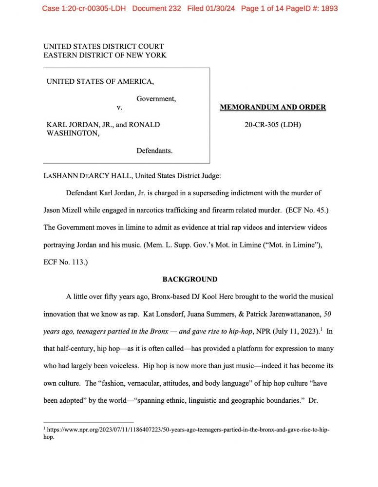Esta decisión se ha tomado en base a la solicitud del gobierno de admitir las letras de los temas del acusado Karl Jordan Jr. como evidencia de culpabilidad. Sin embargo, la jueza argumentó que dichas letras, a pesar de contener a menudo temas de violencia y criminalidad, tienen poco valor probatorio en un juicio. Según ella, estos elementos son tan frecuentes en las letras de rap que su uso como evidencia se vuelve injusto y potencialmente engañoso.