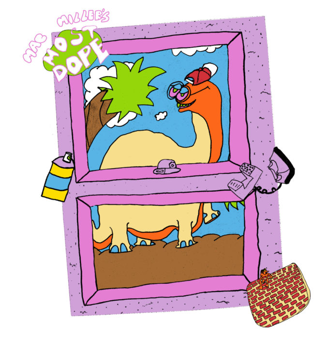 El resultado de esta colaboración entre Mac Miller y Mikey Alfred nos deja una línea de camisetas en una variada gama de colores brillantes, que muestra una ventana desde la que podemos ver a un dibujo animado de un dinosaurio observando una palmera.