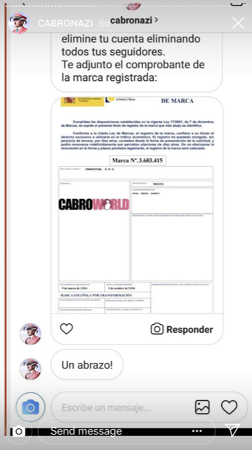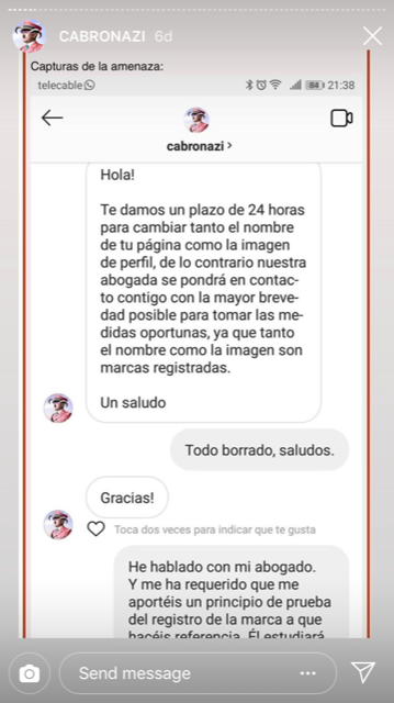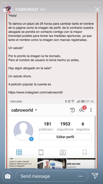 El caso es que dicha cuenta ha estado inactiva los últimos años, hasta que hace poco, y fruto del aburrimiento veraniego, la persona que la creó decidió empezar a subir contenido por echar el rato. Y aquí es donde empieza el lío. Gracias a que el usuario compartió en FC lo que le había pasado -y a la difusión que le dieron otras cuentas como la de King Cani-, pudimos saber que Cabroworld había recibido unos mensajes nada cariñosos por parte de Cabronazi para que borrase su imagen de perfil y le cambiase el nombre a la cuenta.