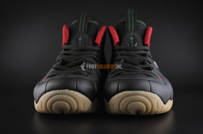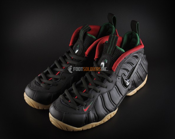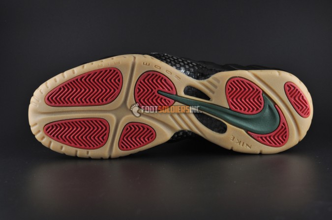 Nike ha sacado a la luz una serie de imágenes de su próximo lanzamiento que sigue la línea de las Nike Air Foamposite Pro “Yeezy», con un predominio del color negro esta vez en mate fusionando el rojo y el verde en algunos detalles de la malla. La singularidad del modelo se encuentra en el color de la suela que está compuesto por un tono oro al estilo Gucci.