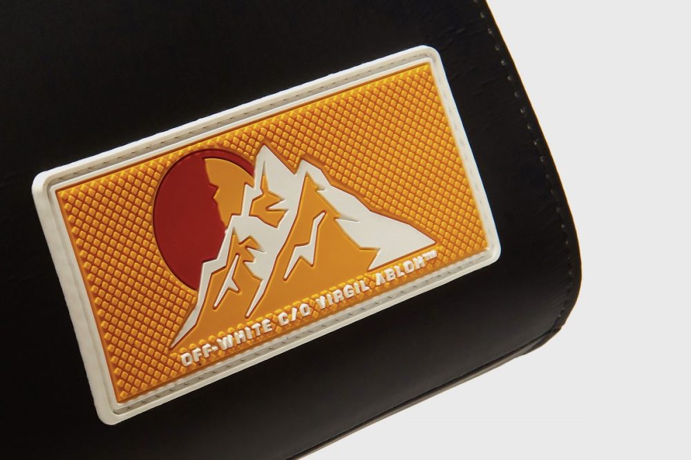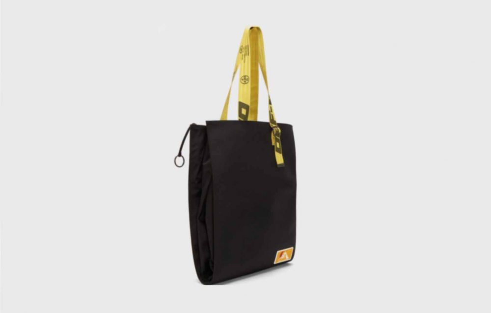 La bolsa escapa de los clásicos estampados tipográficos de Off-White y deja paso al negro básico de toda la vida. Los detalles llegan con las asas color amarillo, con el logotipo de la marca escrito, y el parche de goma con el dibujo de la montaña.