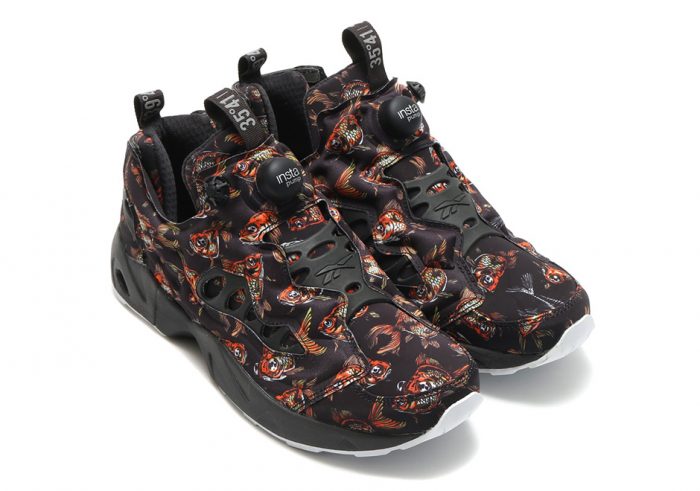 Si por si acaso el diseño de las sneakers no tuviera personalidad suficiente, Reebok ha cubierto las Instapump de un estampado repleto de peces de colores sobre un fondo de color negro. Para completar el look, también nos encontramos con una media suela negra y la suela blanca para ofrecer un ligero contraste con el resto de las zapatillas.