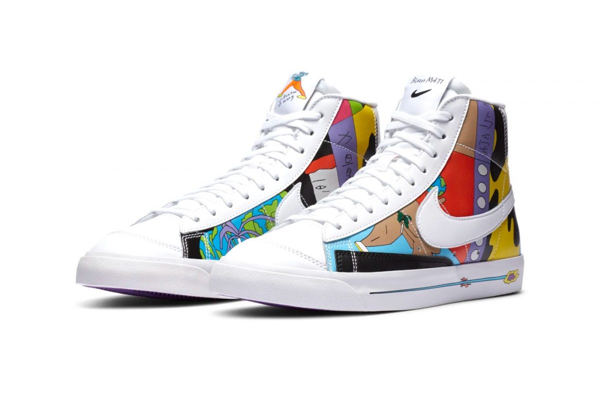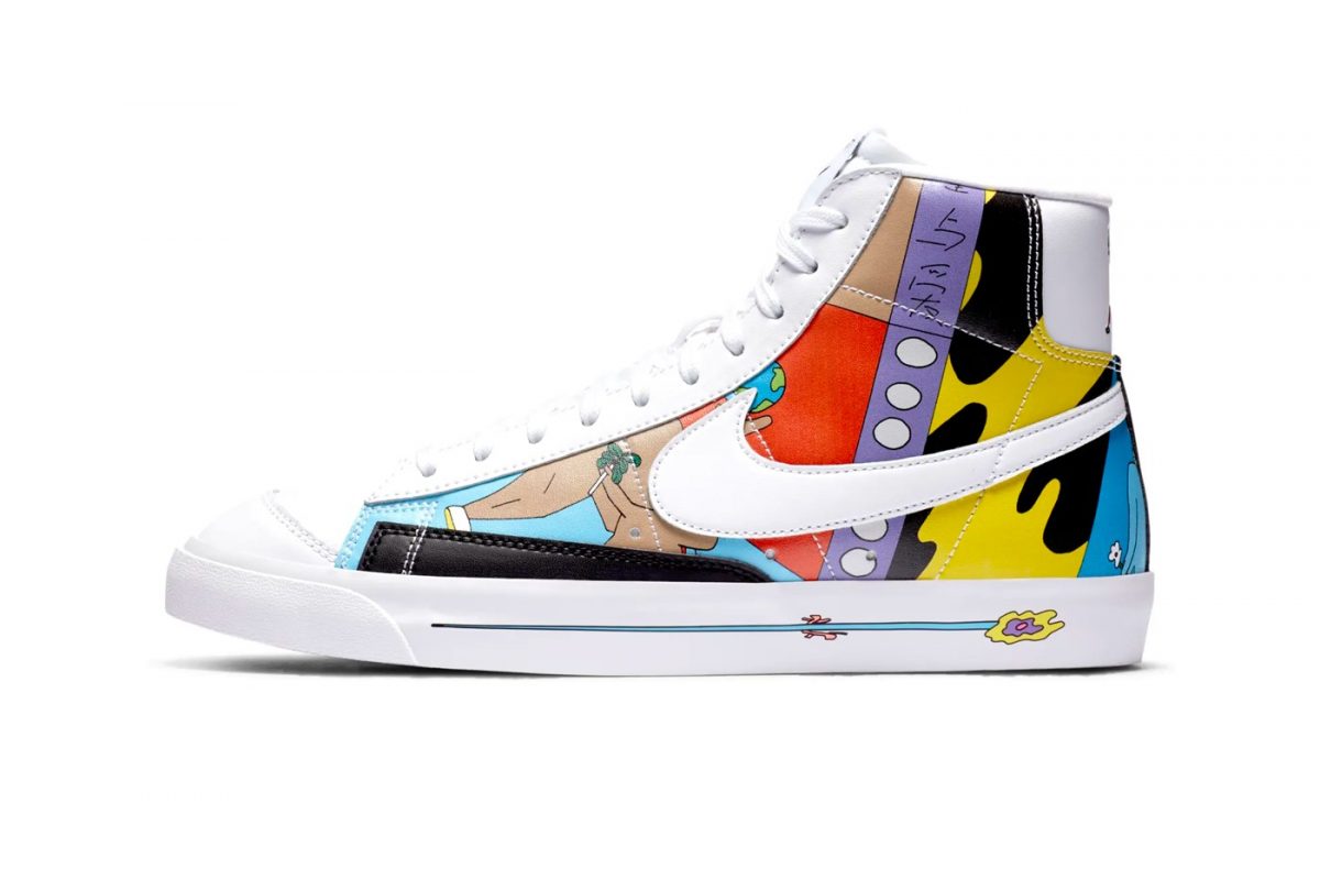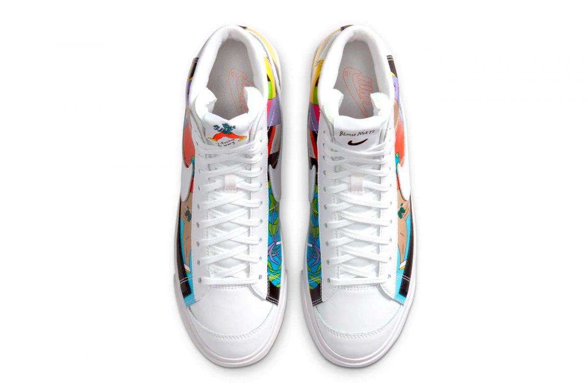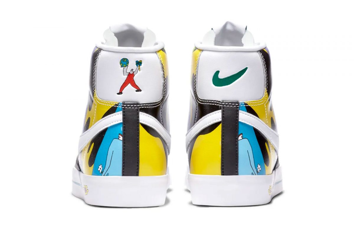 En las Blazer nos encontramos con unos colores que van desde el morado de la suela hasta el naranja o el amarillo. Estos pintan las diferentes imágenes que cubren la parte más visible de la zapatilla, entre las que podemos identificar un par de piernas y un globo terráqueo. No son los únicos detalles curiosos, también nos encontramos una lengüeta diferente para cada pie, como también ocurre en el branding trasero.