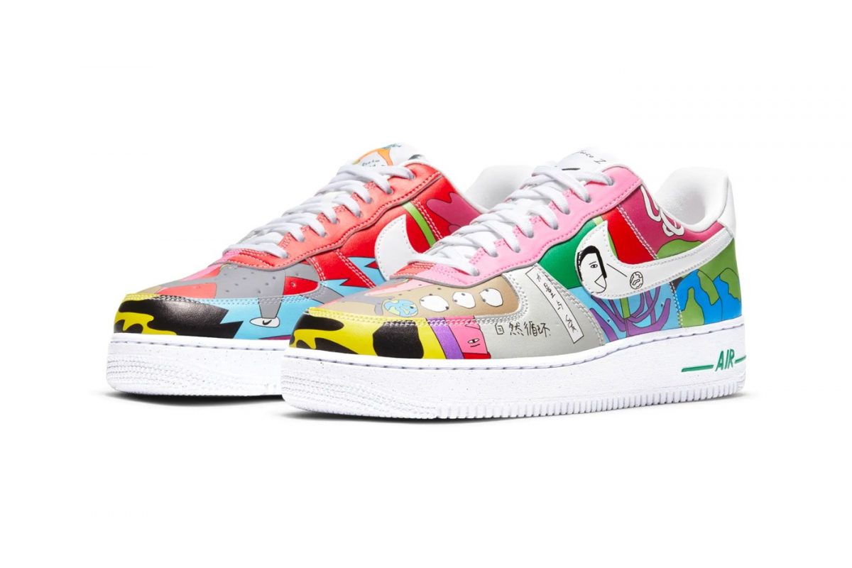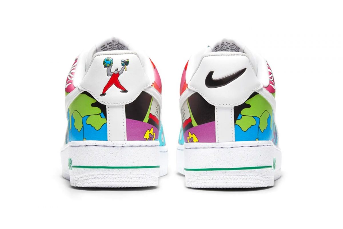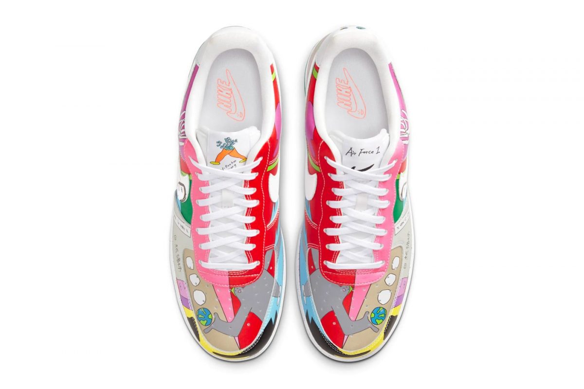 Finalmente, las Air Force 1 son el par con una gama de colores más amplia dentro de la colección. Entre estos destacan el rosa y el rojo que podemos ver en las zonas cercanas a los cordones. Algunas de las ilustraciones que se ven a lo largo del par son caras o la Tierra, algo más que recurrente en toda la colección.