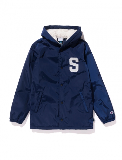 La chaqueta, en color azul marino con una S en la parte delantera, se complementa con el logo de Stüssy en la zona de atrás. Las sudaderas están confeccionadas con el material Reverse Weave de Champion y cuentan con el logo de Stüssy en la parte posterior de las mismas.