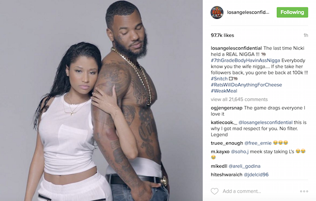 The Game no se ha escondido en ningún momento, y ha ido desde comparar al dueño de Dream Chasers Records con Future de ‘8 Millas‘ hasta a publicar una foto suya con Nicki Minaj, asegurando que esa fue la última vez que ella agarró a un ‘real nigga‘. La cosa está que arde.