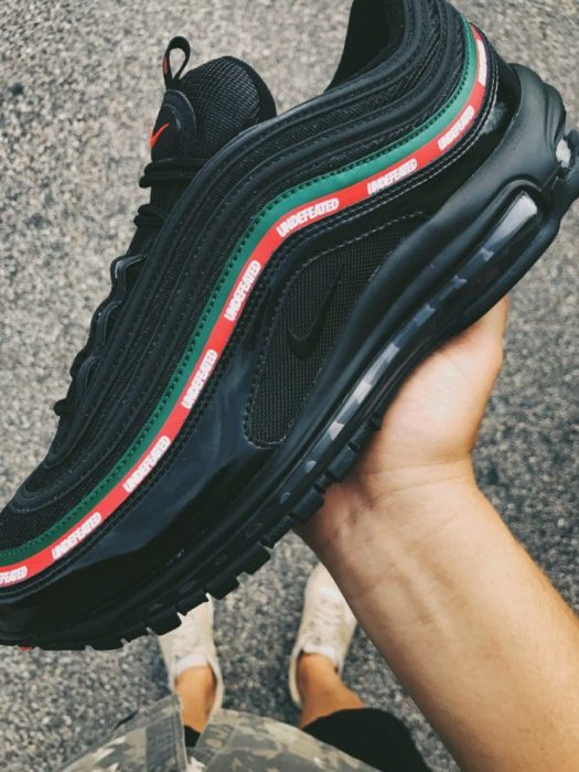 Como podemos ver, se trata también de unas sneakers dominadas por el negro, aunque si hay algo que sorprende y llama la atención es la línea de color verde y rojo –recordando en gran medida a Gucci- con el branding de UNDFTD que recorre toda la parte superior de las zapatillas. Pero más allá de eso, la silueta de las Air Max 97 se mantiene intacta con los elementos que la hacen tan reconocibles como la tradicional cámara de aire o la suela de goma.